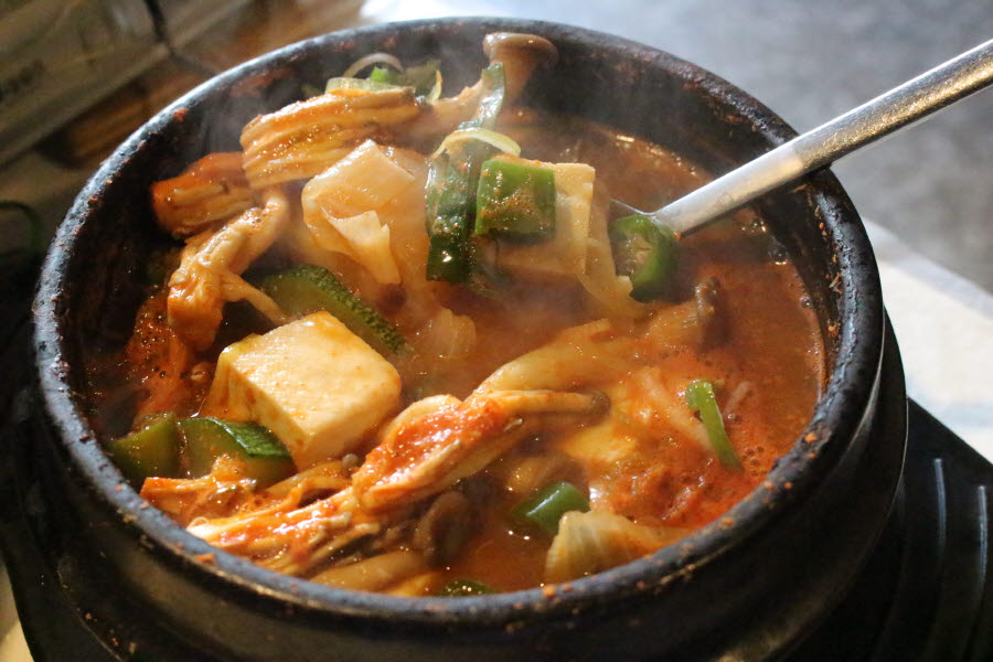 3. 뚝배기가 끓어오르면 불을 조금 낮추고, 양파, 느타리 버섯, 청양고추를 넣어준다.