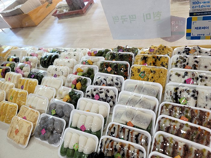 떡 색깔이 예뻐서 멀리서도 시선을 사로 잡는 매력이 있는 진열대.