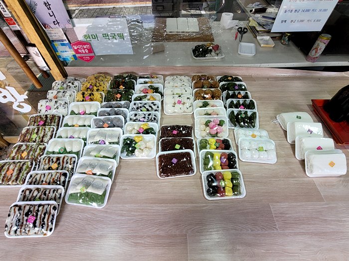 떡 색깔이 예뻐서 멀리서도 시선을 사로 잡는 매력이 있는 진열대.