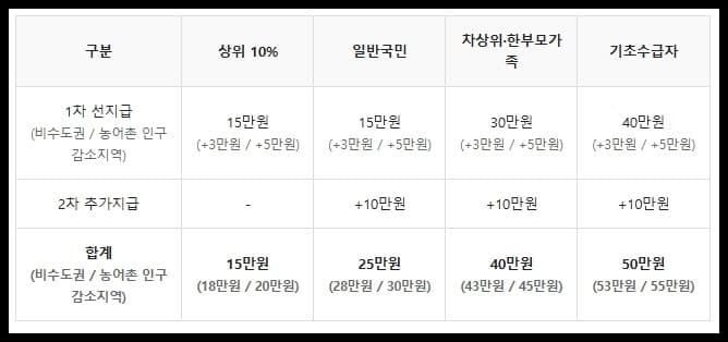 기본적으로 1인당 15만 원이 지급되며, 차상위계층과 한부모가정은 30만 원, 기초생활수급자는 40만 원을 받게 됩니다.