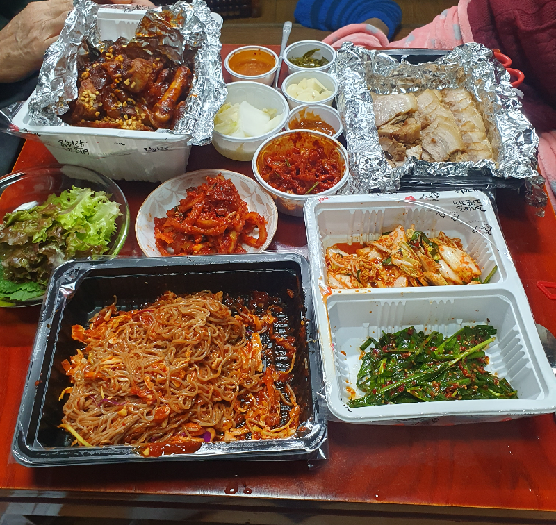 배달온 불족발과 보쌈세트에는 비빔 막국수, 김치겉절이, 부추무침, 백김치와 깻잎, 상추, 쌈장, 새우젓, 마늘, 고추, 보쌈속 무로 구성되었고, 장모님이 홍어무침을 추가로 내어 주셨다.