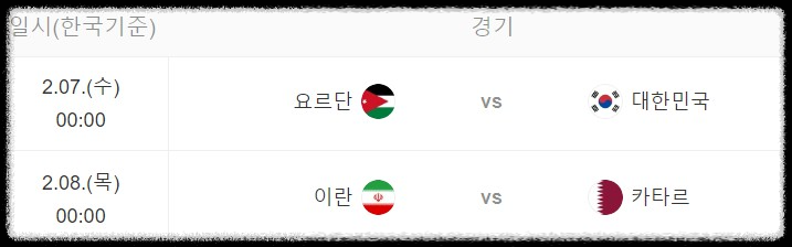 한국시간을 기준으로 2024년 2월 7일 수요일 새벽 0시( 2월 6일 화요일 밤 11시 59분 시작)에 한국과 요르단의 축구 4강 경기가 시작된다.