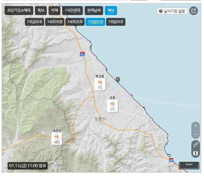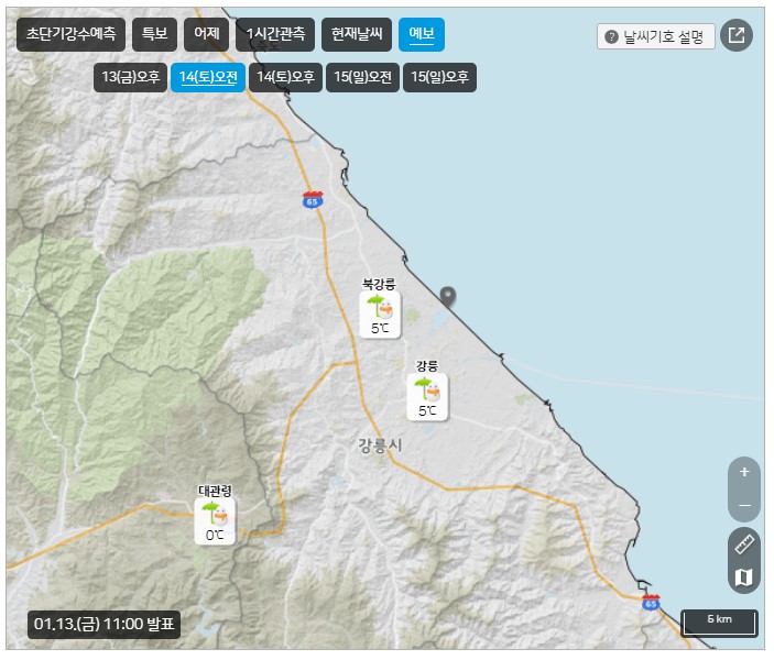 1월 13일 금요일 기상청 발표한 강원도 강릉지역의 날씨다.