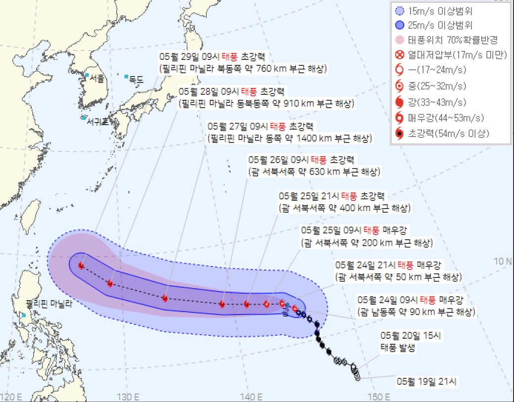 태풍 마와르 예상경로나 진로방향이 어떻게 될지는 5월 28일 밤에서 29일 오전 중 결정될 것으로 기상청은 내다보고 있다.