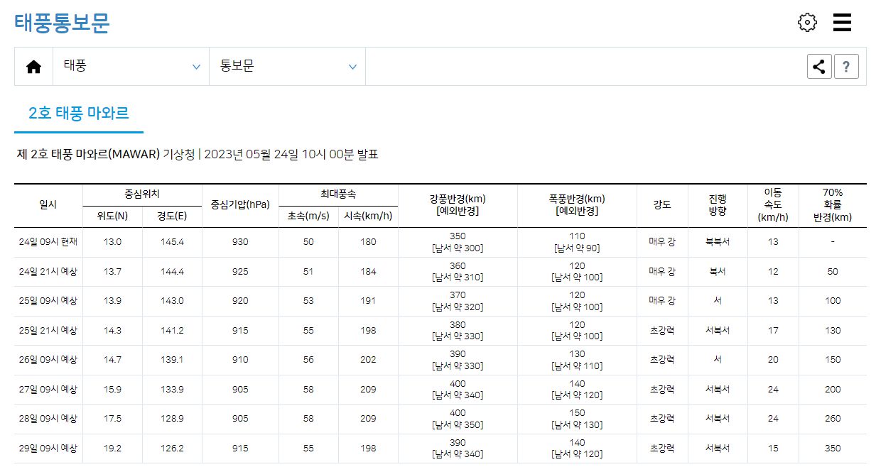 하루 몇번씩 기상청은 제2호 태풍 마와르의 정보를 내보내고 있다.