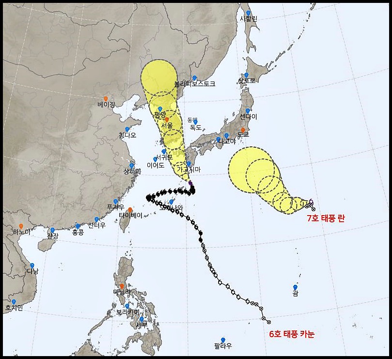 태풍 카눈이 한반도를 향해 북상하는 것과 별개로 제7호 태풍 란(LAN) 태풍이 일본 열도를 향해 발달하고 있는 상태이다.