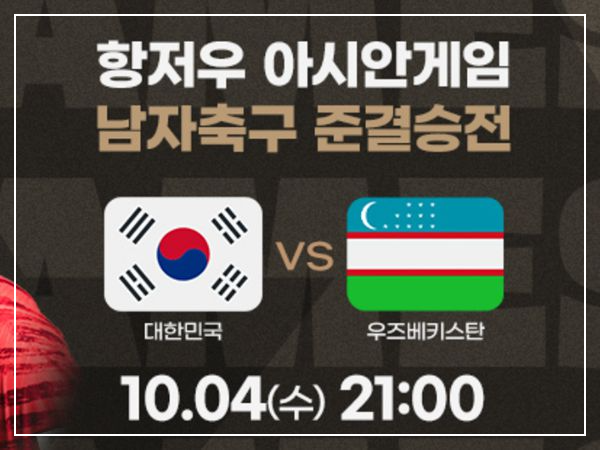 항저우 아시안게임 남자 대표팀이 10월 4일 수요일 밤 9시 우즈베키스탄과 결승전 진출을 놓고 중국 황룽 스포트센터 스타디움에서 한판 경기를 펼칩니다.